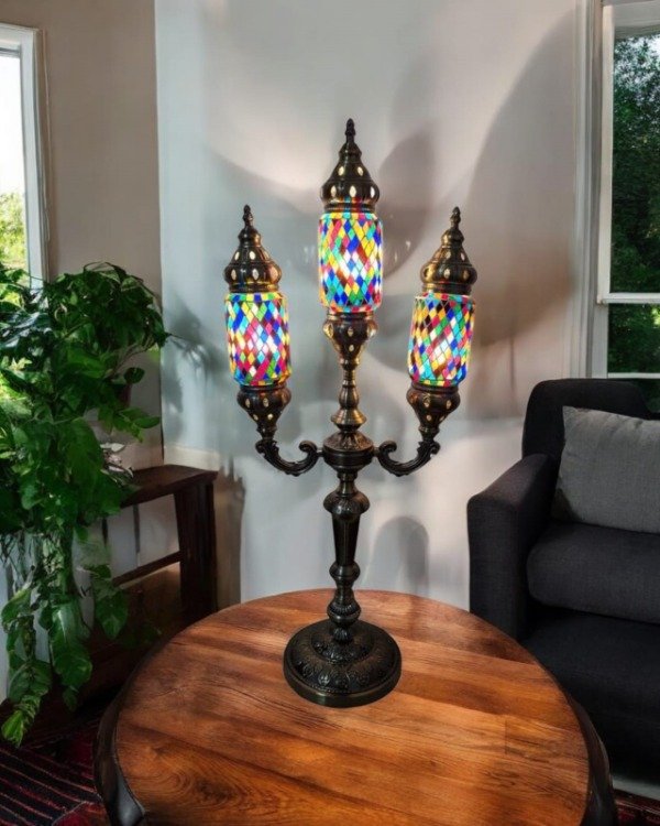 Lámpara Velador Turco con 3 tulipas de vidrio en tubo.